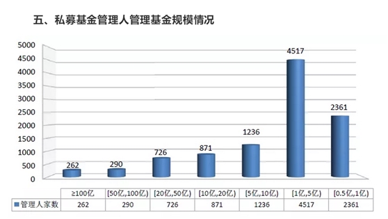 管理基金規模在20億—50億元的有726家,管理基金規模在10億—20億元的有871家,管理基金規模在5億—10億元的有1236家,管理基金規模在1億—5億元的有4517家,管理基金規模在0.5億—1億元的有2361家。截至2019年12月底,已登記的私募基金管理人有管理規模的共21306家,平均管理基金規模6.45億元。